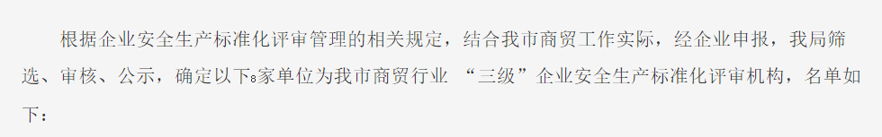 厦门市商务局关于商贸行业安全生产标准化“三级”达标企业评审机构资格确认的公告